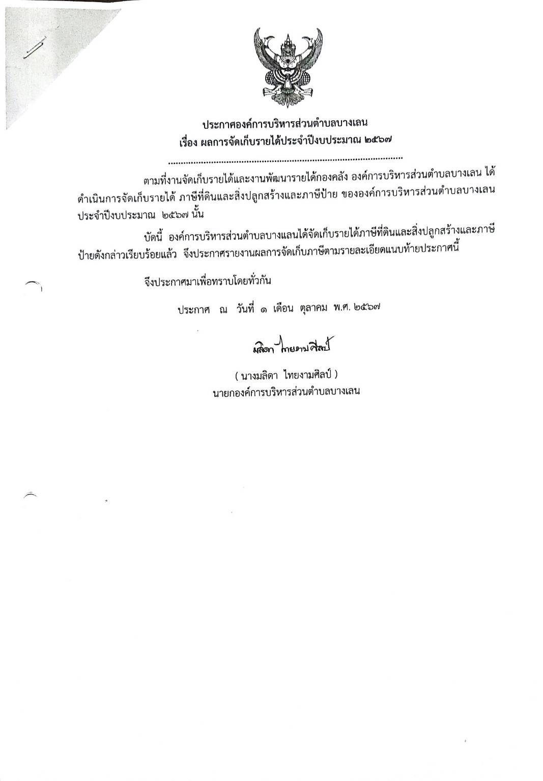 ผลการจัดเก็บรายได้ประจำปีงบประมาณ 2567